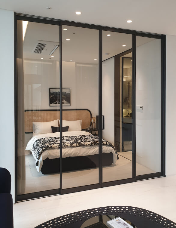 심플하고 세련된 디자인에 다양한 패턴 유리와 프레임 색상을 적용할 수 있어 현관 중문, 드레스룸, 알파룸, 욕실 입구 등 다양한 공간에 활용 가능합니다. 단순한 도어를 넘어, 공간을 더욱 세련되게 연출하는 인테리어 요소로도 손색이 없습니다. 또한, 공간에 맞춰 다양한 크기로 주문 제작이 가능하며, 프레임과 유리 사이를 실리콘 노출 없이 체결하는 특허 방식을 적용해 마감이 더욱 깔끔하고 고급스럽습니다.